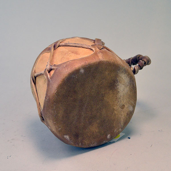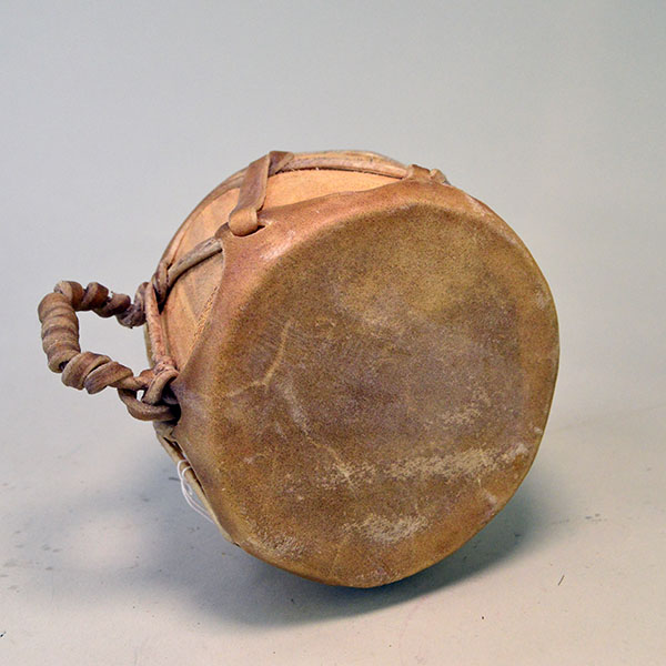 This handmade Taos-style double-headed drum delivers a distinctive sound. The artisan shaped the frame from cottonwood and tightly bound rawhide rounds to each end using rawhide lace. He knotted the ends into a practical handle. He left the rawhide in its natural state, preserving its organic texture and tone. It stands 4 inches tall with heads measuring approximately 4.75 inches across, though not perfectly round. You will find this drum in very good condition, ready to be played or proudly displayed.