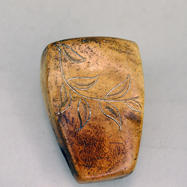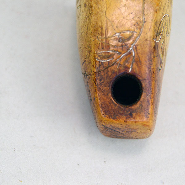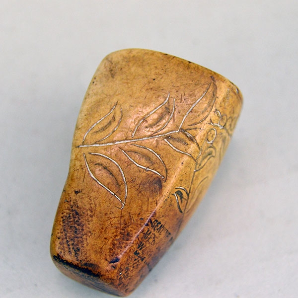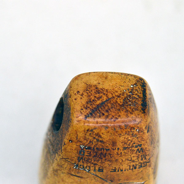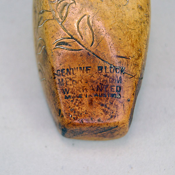 It is hot stamped Genuine Block meerschaum made in Austria. It measures 2″ x 1.25″ at the widest point. The stem hole measures .25″ in diameter. We got this item from a collection. It shows signs of use. One of a Kind.