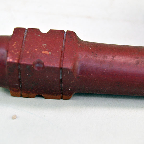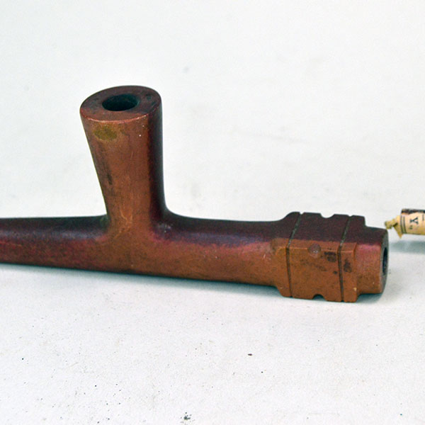 This Pipe- Catlinite Bowl & Stem is a striking mid‑century piece. The artists carved both pieces from Catlinite. A small wooden dowel joins the bowl and stem. The hand‑carved bowl measures an impressive 6.5 inches, and the matching 12‑inch Catlinite stem gives the pipe strong visual presence. The set dates from the 1950s to the 1960s. A small chip appears at the end of the stem, a minor age‑appropriate mark that does not detract from its character or completeness. This collectible Catlinite bowl‑and‑stem pipe will stand out beautifully in any collection.