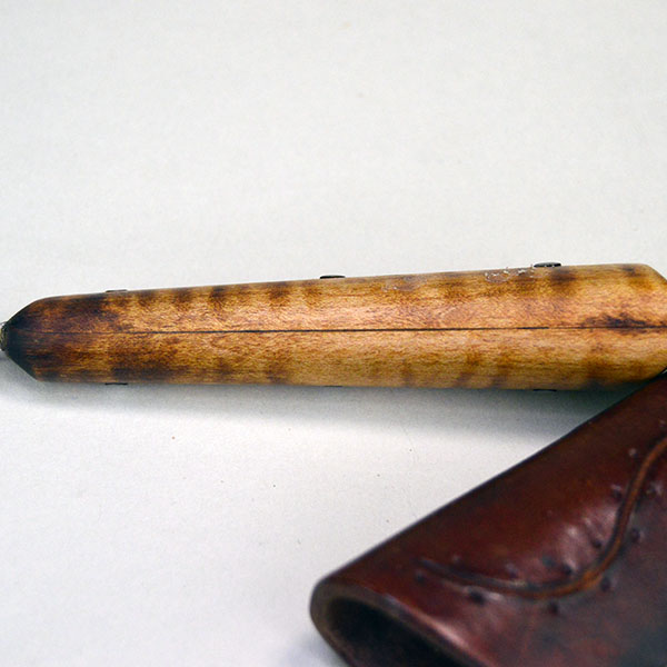 This Knife & Sheath Maple Handle features a beautifully shaped maple wood blade paired with a tooled leather sheath in a one‑of‑a‑kind design. Measuring approximately 10.5 inches, it blends traditional craftsmanship with natural materials. It is an eye‑catching piece for collectors, cultural educators, or anyone who appreciates handmade artistry.