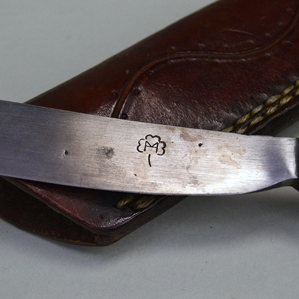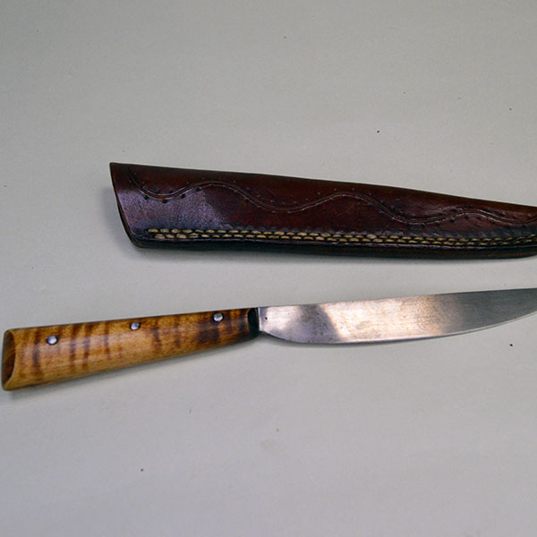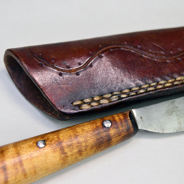The maple handle is smoothly carved and lightweight. It offers a warm, organic look that contrasts nicely with the detailed tooling on the sheath. The sheath’s unique patterning adds depth and character, making this set ideal for display or gifting.