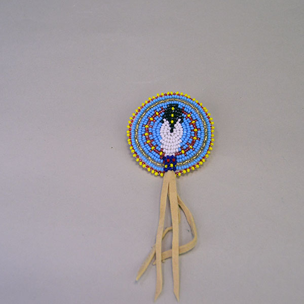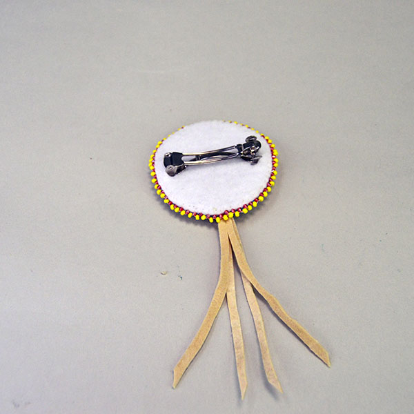 Enjoy the bright sparkling colors of this Barrette- Feather Beaded Rosette! Master Craftsman Andy Bullock created this One of a Kind Barrette with Cut 13/0 Seed Beads in Turquoise, White, Royal Blue, Yellow, Red, Transparent gold, Transparent Red and Black Seed Beads. At the center is a beaded Eagle Feather design. Andy added 4 tassels made from deerskin leather lacing to the bottom of the barrette. Then he added 3 dimensional edge beading around the entire barrette with Yellow and cut Transparent Red colored Seed Beads. Andy covered the back with White Pellon fabric.