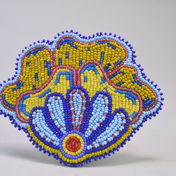 Enjoy the bright, sparkling colors of this Barrette- Floral Design. This eye‑catching, one‑of‑a‑kind piece was handcrafted by Master Craftsman Andy Bullock. He created this standout barrette with French repro seed beads in transparent pink, royal blue, greasy yellow, yellow, red, transparent red, and transparent blue, giving it rich color and incredible shine. Andy added a bold three‑dimensional edge using cut navy‑blue seed beads, creating depth that instantly draws attention. He finished the back with white Pellon fabric.