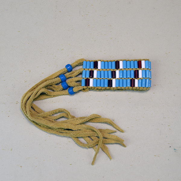 This Wampum Three Row Bracelet features Glass Wampum Beads in Light Blue, White and Trans Red. Master craftsman Andy Bullock made them with Smoke colored deerskin leather lacing. The Bracelets come with blue Crow Bead closures so you can adjust the fit. One size fits all!
