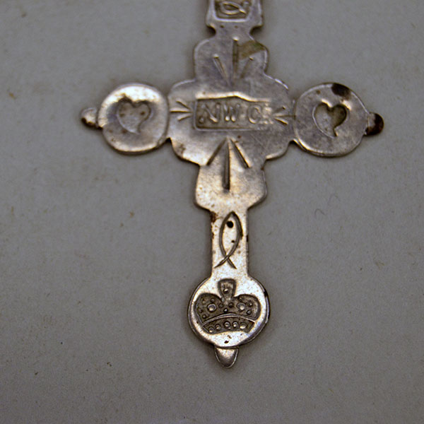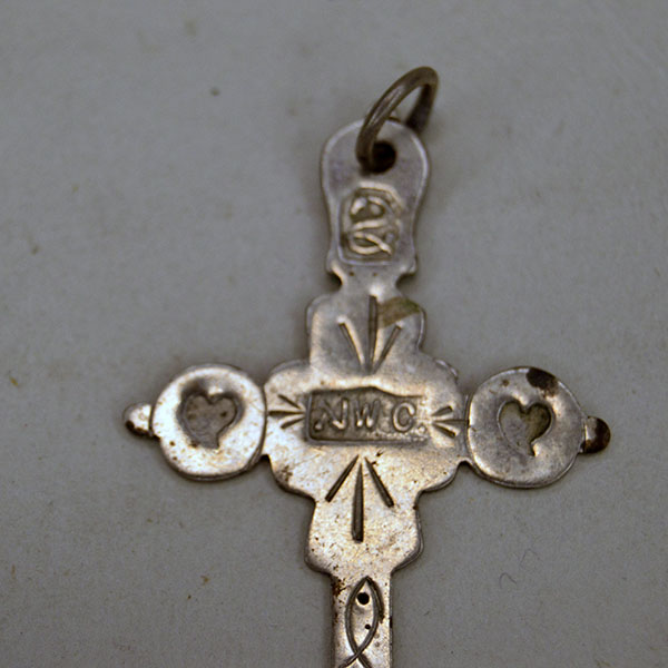This French made Pendant- Cross showcases exceptional hand‑crafted detail. The silversmith stamped it with symbolic motifs—a crown, hearts, a serpent, and a fish—along with NWC stamp. He made it with sterling silver. The pendant measures 2″ long x 1.5″ wide. The craftsmanship is solid and refined. It is a striking choice for collectors, stylists, or anyone drawn to meaningful, well‑made silverwork.