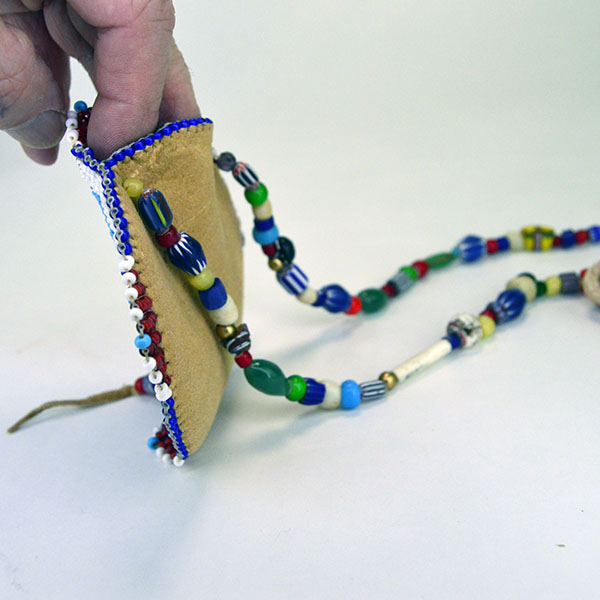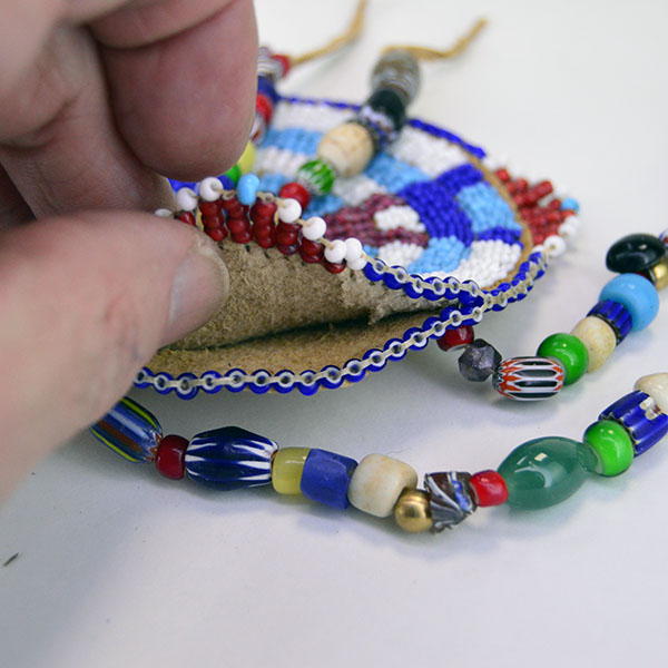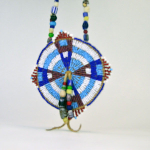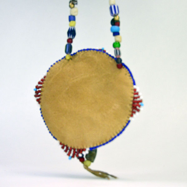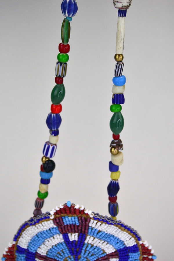 This piece is edge‑beaded for added dimension and includes a small opening between the front and back leather layers. From the center of the rosette, two dangles of assorted trade beads extend, adding movement and visual interest.