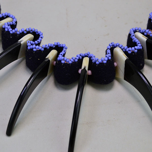 Wear this Bear Claw 3″ Necklace to your next event or add it to your collection! Master Craftsman Andy Bullock made this Bear Claw Necklace with 3 inch long Imitation Bone Bear Claws with knuckles. Andy threaded them with imitation sinew, and strips of Navy Blue Selvedge Edge wool. Lampwork Beads appear between each claw and Andy added a row of edge beading with periwinkle pony beads. He used braided Braintanned Deerskin Leather Lacing for the chain and strung Navy Blue Crow Beads and Lampwork beads on it.