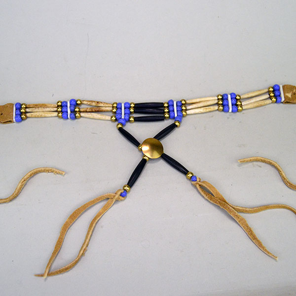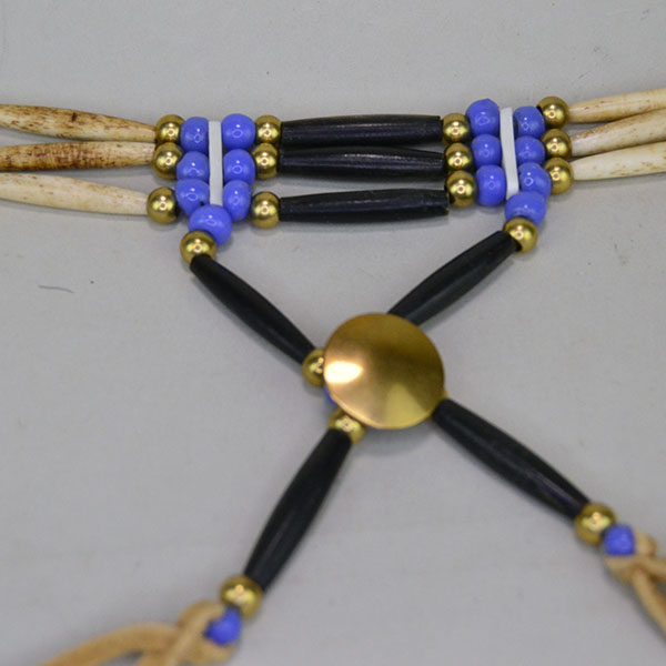 This three row Choker- Bone and Horn comes with a unique combination of Antiqued Bone Hairpipe and Horn Hairpipe. Master craftsman Andy Bullock created it using Braintanned deerskin leather lacing. He added Periwinkle Crow beads, Brass beads and Bone Choker Spacers. The front drop features a 1″ Brass Concho. This Choker- Bone and Horn measures 15 inches long with 9‑inch ties, and the drop extends 9 inches.