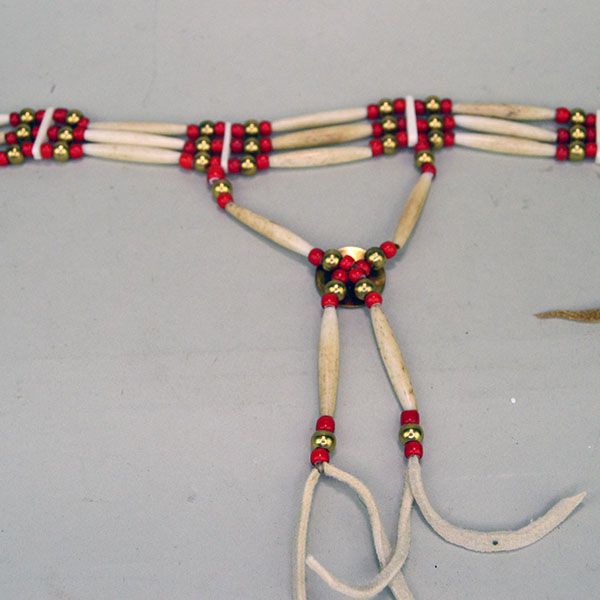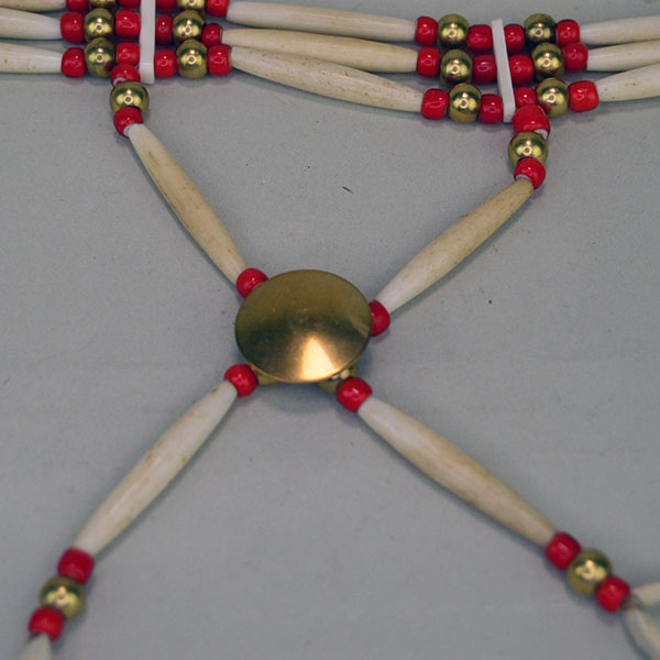 Add this Choker- White Center Red 3 Row to your collection or wear it as part of your everyday attire. Master craftsman Andy Bullock created it with White Center Red pony beads, Brass Beads and 1.5 inch Antiqued Bone Hairpipe. He used Bone Choker spacers and Braintanned deerskin leather lacing for the ties. The front drop features a 1″ Brass Concho surrounded by White Center Red Pony Beads. This Choker- White Center Red 3 Row measures 16 inches long with 9‑inch ties. The front drop extends 8.5 inches.
