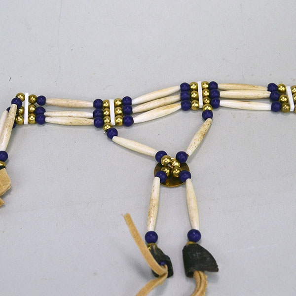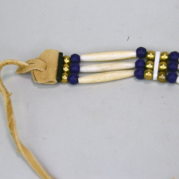 This striking three row Choker- With Deer Toes is made with Antiqued Bone Hairpipe. Master Craftsman Andy Bullock created it with 1.5 inch Antiqued Bone Hairpipe, Round Navy Blue Beads, Brass Beads and Bone Choker Spacers. For the ties, he added Braintanned deerskin leather lacing. The front drop features a 1″ Brass Concho. Andy strung the drops with Bone Hairpipe, Blue and Brass Beads and Deer Dew Claws. This Choker- With Deer Toes measures 15.25 inches long with 10‑inch ties. The drop extends 8 inches.