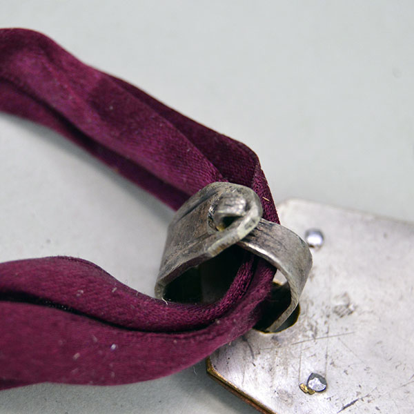 The cross measures 6″ x 3.5″ and hangs from a silver ring made from an old eating utensil—an unexpected detail that adds charm. A rich maroon silk cord completes the piece, giving it a soft, elegant contrast. This necklace stands out as a distinctive statement for collectors and lovers of artisan craftsmanship. One of a Kind.