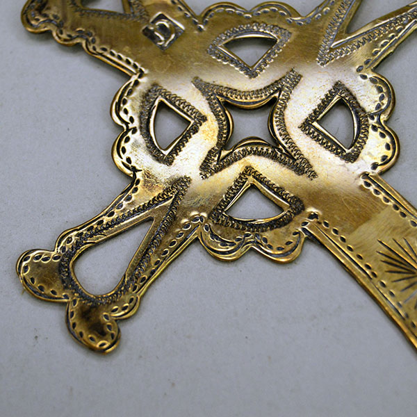 This gold‑plated sterling silver cross necklace delivers bold size and intricate artistry. The 12.5″ silver chain supports a striking 3.75″ x 3″ cross. An elaborate stamped design covers the surface, and a small letter D hallmark marks the top. The crafter cut out heart, triangle, star, and teardrop shapes on it. The piece stands out as a distinctive, eye‑catching choice for collectors, living history re-enactors, or anyone who appreciates meaningful, well‑crafted silverwork.